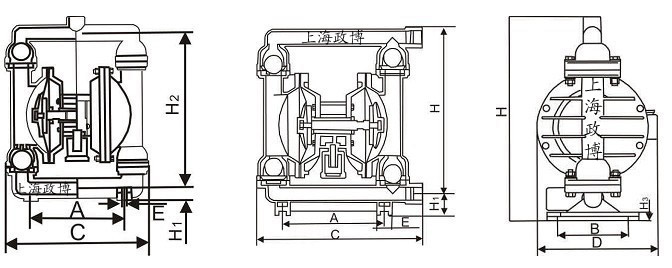七、上海政博QBY塑料气动隔膜泵主要外型尺寸参数: